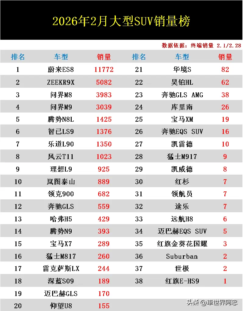 导读:随着新能源的爆发,外资品牌引以为傲的高端大型SUV领域已经逐渐沦陷了,大部分销量已被多款国产车型分割殆尽,曾经的明星光环已彻底不再了。根据乘联会最新公布的2026年2月大型SUV终端销量排行榜来看,在榜单头部阵营里面陈列着清一色的国产品牌车型,其中蔚来ES8、ZEEKR9X、问界M8位列榜单前三甲,问界M9、腾势N8L也都不甘示弱双双杀入前五名,智已LS9、乐道L90、风云T11、岚图泰山等国产新能源车型也都在这一高端细分市场崛起了,成功占据着榜单前十名中的一席之地。而以往最能打的外资品牌车型奔驰GLS销量急剧萎缩,排名已滑落至第12名,宝马X7更是差点被跻出榜单前十五名。大获全胜!2月大型SUV终端销量排名:国产包揽前11名,库里南第24